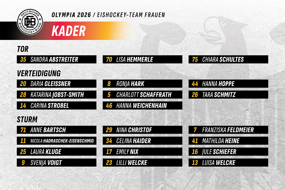 Die Frauen-Mannschaft trifft sich am Montag, den 26. Januar 2026, am Bundesstützpunkt Füssen, um sich auf die Olympischen Winterspiele 2026 vorzubereiten. Die drei PWHL-Spielerinnen Sandra Abstreiter, Katarina Jobst-Smith und Laura Kluge stoßen am Freitag, den 30. Januar 2026, zur Mannschaft. Zum Start des Olympia-Camps wird der Kader deshalb um zwei weitere Spielerinnen erweitert, die das Team in dieser Phase zusätzlich unterstützen.